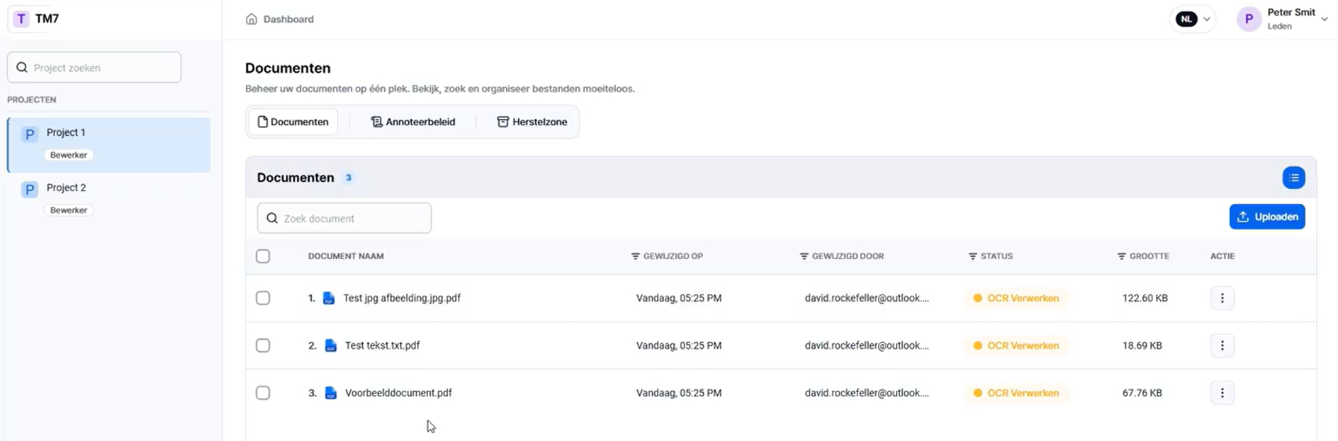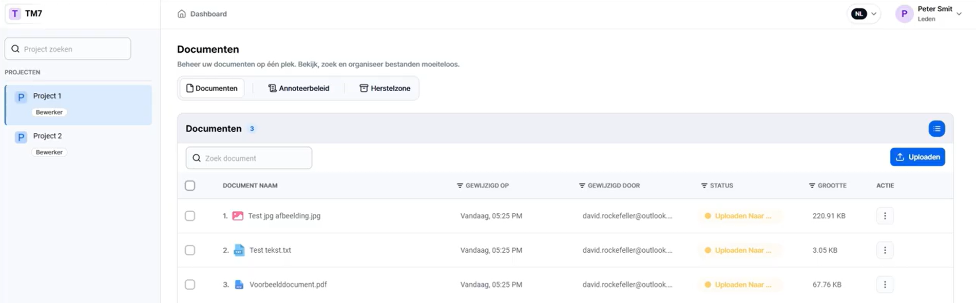 Linksboven (TM7) kun je zien in welke organisatie je op dit moment bent. Daaronder (Project 1 & Project 2) is een lijst te zien van de projecten waartoe jij toegang hebt. Rechtsboven (Peter Smit) is te zien wie er momenteel is ingelogd.