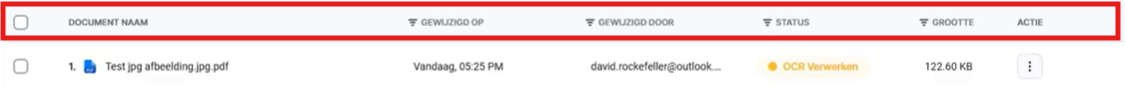 Op zowel deze statussen als de andere metadata van de documenten kun je sorteren middels de balk boven de documenten:
