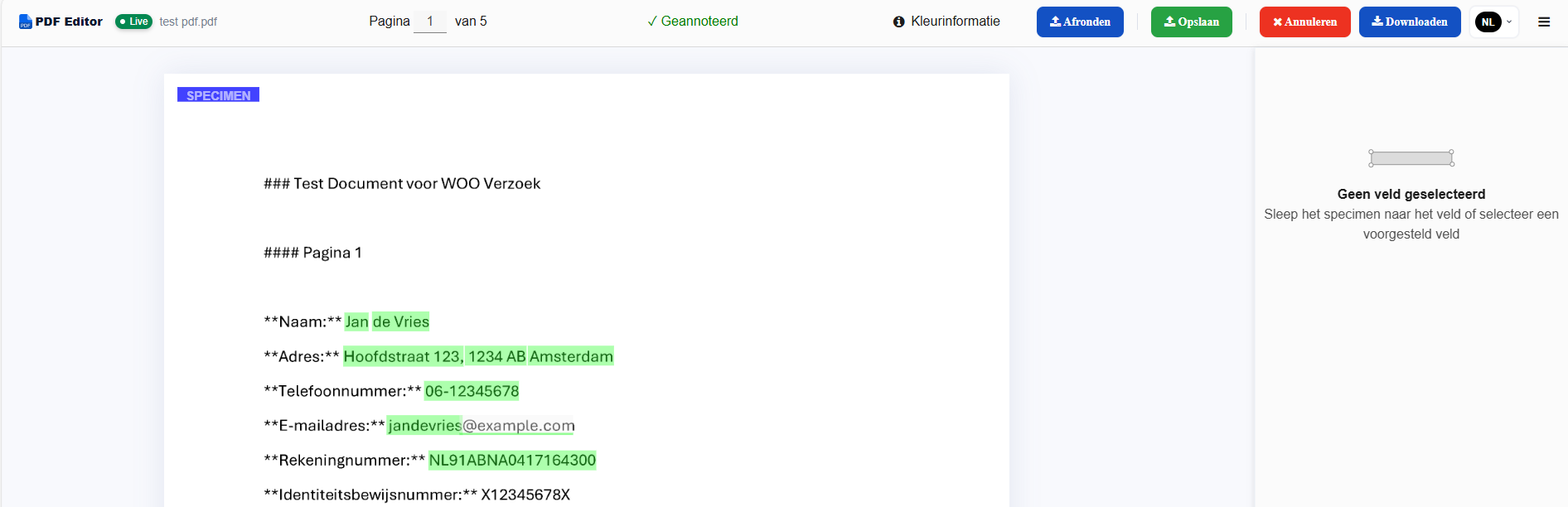 De groene balkjes zijn geannoteerde onderdelen door het systeem. De groen onderstreepte woorden zijn suggesties gemaakt door het systeem. Als je zelf een stuk tekst wil anonimiseren kun je deze tekst selecteren middels SHIFT + A. Hiernaast kun je ook een woord selecteren en op A drukken om dit woord te anonimiseren. Ook kun je het balkje SPECIMEN, die hierboven te zien is, verschuiven en over een stuk tekst plaatsen. De annotaties die gemaakt zijn, zijn blokjes die versleept kunnen worden en groter en kleiner gemaakt kunnen worden. Hiermee kun je ook het document bewerken. Annotaties kunnen door middel van backspace ook verwijderd worden uit het document.